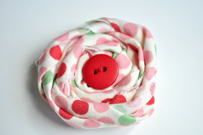 Create a fabric rosette with your long strip of coordinating fabric and fabric glue. Hand sew a button in the middle.